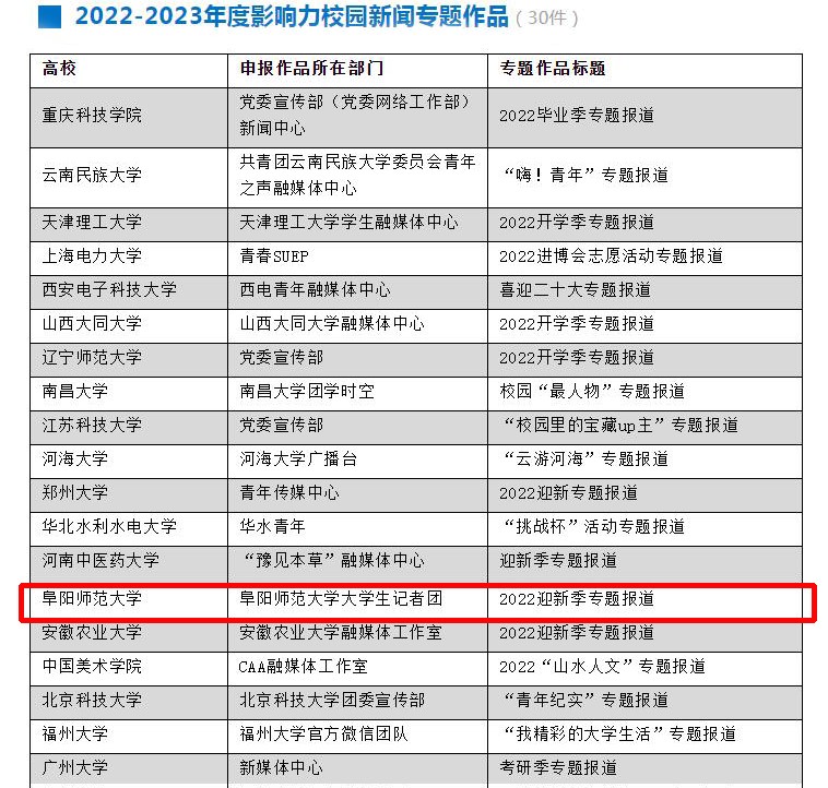 由中国青年报社、中青校媒共同举办的“寻找2022-2023年度高校可视化媒融团队”评选活动结果揭晓,我校《迎新季系列报道》获评“2022-2023年度影响力校园新闻专题作品”荣誉称号。这是继2021年、2022年获奖后,我校再次获评“全国高校百强校园新闻专题作品”殊荣。本次获奖新闻作品聚焦服务学生为根本,充分利用视频、图文、H5等多种新媒体形式对其进行可视化专题报道,多平台联动合作,力求突破创新。系列报道共9篇,按新生到校时间节点之开学前,从学、住、食、行等方面为新生介绍学校,帮助新生了解自己所属学院的特色和优势,展示学校的校园环境和生活氛围,让新生更加真实地感受到学校的人文关怀和学习氛围,为新生提供全面准确的信息,帮助他们更好地了解学校、融入大学园生活;开学后,直击开学现场,全方位、多角度报道新生入学报到实况,记录下同学们在阜师大开启人生新篇章,让青春在奋斗中焕发出更加绚丽的光彩。