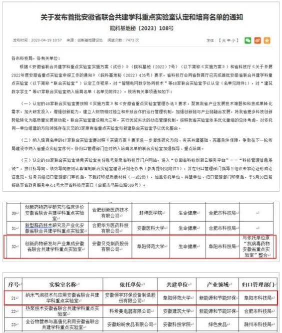 安徽省科学技术厅发布首批安徽省联合共建学科重点实验室认定和培育名单,我校化学与材料工程学院分别与安徽贝克药业有限责任公司、安徽恒宇环保设备制造股份有限公司联合申报的“创新药物研发与产业集成安徽省联合共建学科重点实验室”“纳米气泡技术与应用安徽省联合共建学科重点实验室(培育)”正式获批。安徽省联合共建学科重点实验室,纳入省重点实验室序列管理。以“企业出题—高校院所与企业联合攻关解题—成果与资源双方共享”的开放合作模式建设,实行开放的运行管理机制。面向国家和地方重大发展战略,以市场为导向,将企业技术需求和高校院所学科专业建设、人才培养相结合,开展有组织、系统性的研究。