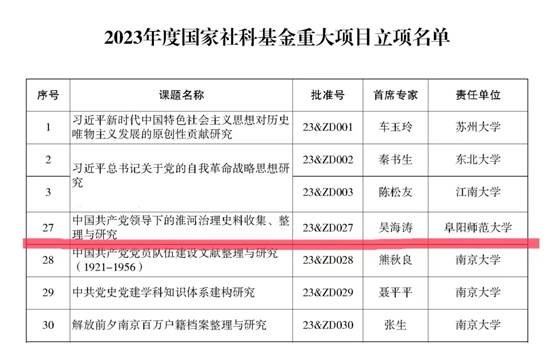 全国哲学社会科学办公室公布了2023年度国家社科基金重大项目立项名单,我校吴海涛教授作为首席专家申报的《中国共产党领导下的淮河治理史料收集、整理与研究》获批2023年度国家社科基金重大项目立项,实现了我校在该级别项目的突破。此次重大项目的立项,既彰显了我校在淮河文化研究方面的优势地位、提升了我校承担国家重大科研项目的能力,又有力的支撑了我校博士点立项建设和一流高峰学科的高质量发展。据悉,2023年度国家社科基金重大项目立项课题为333项,安徽省省属高校共获批立项1项。