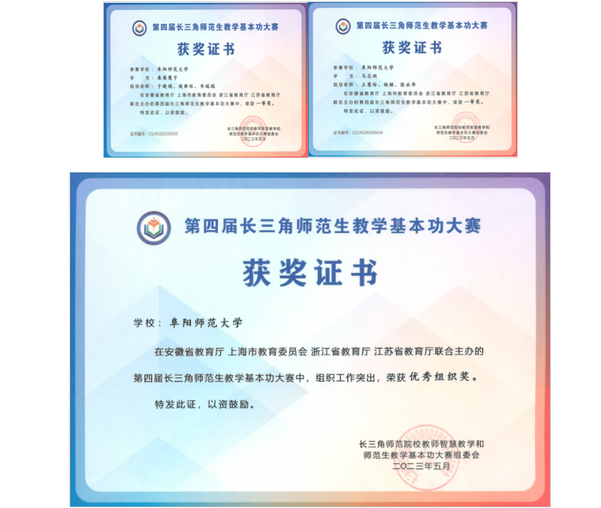 第四届长三角师范生教学基本功大赛圆满落幕,我校学子共获一等奖2项、二等奖3项、三等奖3项,学校获优秀组织奖1项、优秀工作者1项。学校历来重视师范生技能竞赛,致力于以赛促学、以赛促教,让更多的师范生从教学技能竞赛中得到技能的提升和师德的养成。组织指导教师团队为参赛选手精心设计集训方案,积极引导参赛选手在实际教学环境中进行思考与体悟,指导学生不断探求课堂创新点、凝练具有特色的教学设计,充分展示了我校学子的卓越风采,更彰显了我校师范专业育人成效及人才培养质量。