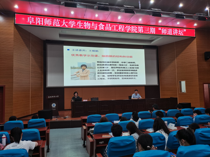 “师道讲坛”由阜阳师范大学生物与食品工程学院主办,旨在贯彻落实师范生关于“加强师德师风建设,培养高素质教师队伍”的精神,不断提高阜阳师范大学师范生的师德、师能和师艺水平,激励广大师范生不忘初心,立德树人,为培养新时代“四有”好老师做积极准备,自2020年至今已举办三期。
