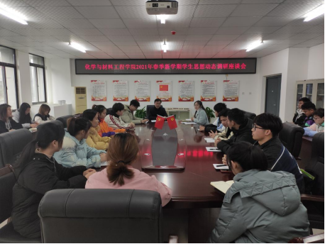 为深入了解学生的思想动态,增强学生教育管理的针对性和实效性,2021年3月10日上午,化学与材料工程学院在西湖校区新工科楼C-207会议室召开春季新学期学生思想动态调研座谈会。学院党委副书记田志坚、团委负责人董淳一、团委挂职副书记王艳丽及学院各班级学生代表参加座谈会。