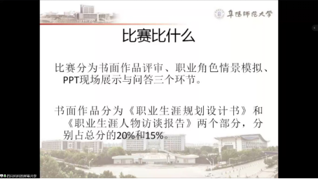 韦瑞瑞说,在制定个人职业规划书的同时,要充分利用身边的资源,制定过程中遇到的问题要善于寻求师长、朋友的帮助。除此之外,她还就参赛表现、着装和规划书撰写上提出宝贵建议。
