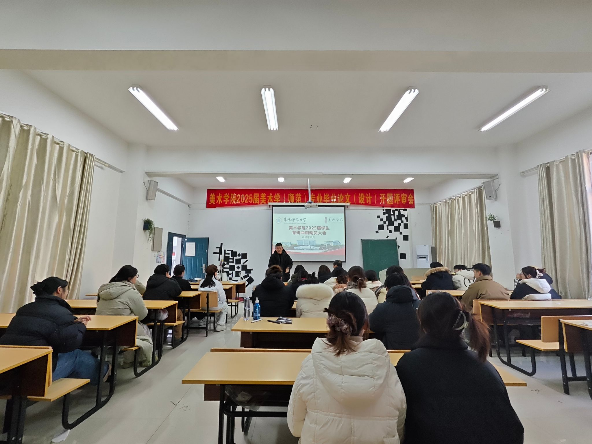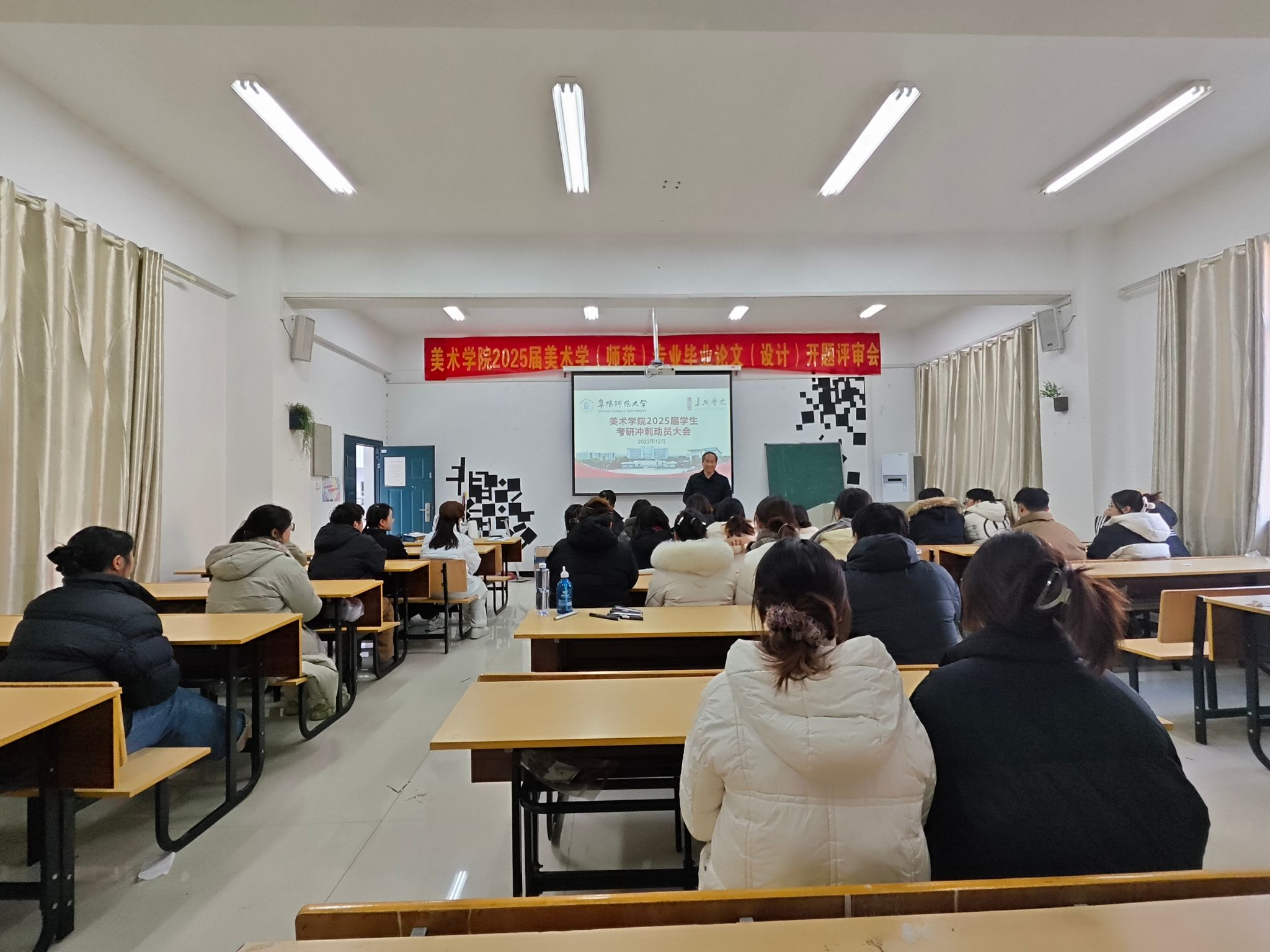 2024年全国硕士研究生招生考试在即,为鼓舞考研士气,坚定考研信心,12月17日下午,美术学院在汉风C楼318教室召开2025届学生考研冲刺动员大会。美术学院党委书记曹礼品,党委副书记、院长魏亮,毕业班辅导员以及2025届考研学子参加会议。