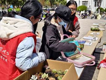 活动当天,工作人员早早在场地摆放好各类生机勃勃的绿植,有序等待师生们用闲置物品前来交换。师生们陆续带着旧书、文具、手工艺品等闲置物品来到现场。在工作人员引导下,大家挑选心仪绿植,完成这场充满趣味与意义的交换。现场气氛热烈,成效显著。