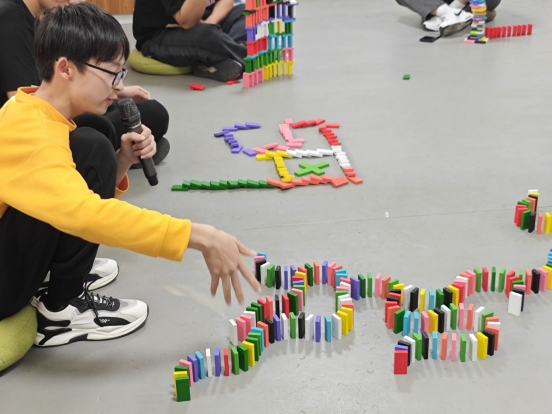 活动过程中,参与同学在阐述所搭建图案的意义并推倒搭建的骨牌后,和其他同学交换位置,给原先搭建的同学拼出代表鼓励的图案,用言语解释其含义并给予支持或建议,这种独特的互动方式,让大家在交流中彼此理解、共同成长。在搭建代表烦恼的骨牌图案时,同学们将抽象的情绪转化为可见的实体,借由搭建的专注过程实现自我疗愈,梳理内心困惑;推倒骨牌,则象征着主动打破心理束缚,完成与烦恼的和解,重塑积极心态。