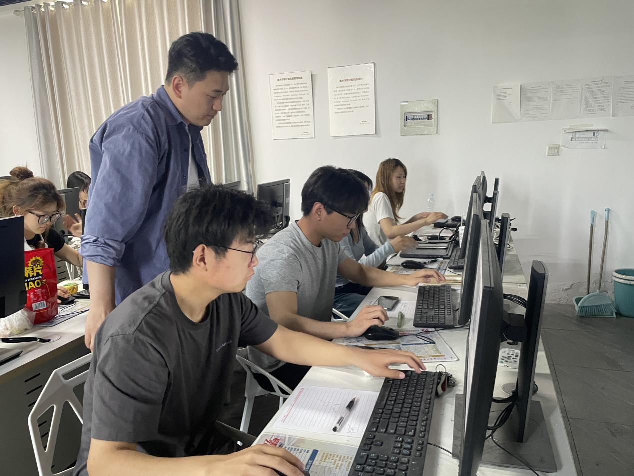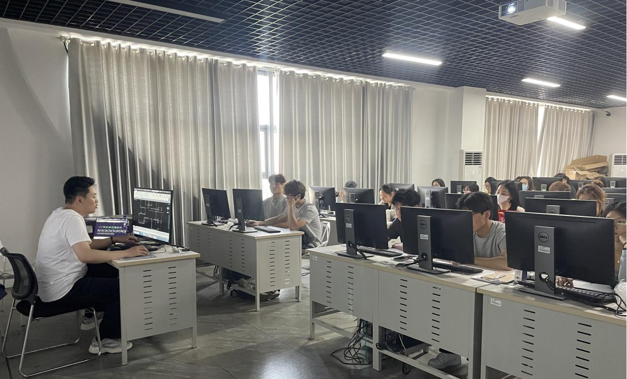 在系统学习平面系统图纸设计规范后,全体学生进入上机实训环节。参训学生依据课程标准,依次完成建筑结构拆改分析图、功能分区平面布置图、天花吊顶设计图三大核心模块的制图实践。实训过程中,尽管前期课程已对技术要点进行详尽解析,同学们在独立制图时仍面临CAD图层管理、空间动线优化、装饰构件标注等多维度挑战。杨标全程跟进实训过程,采用“个性化指导+共性难点集中讲解”的复合教学模式,针对各小组制图进度实时开展三维推演与二维图纸校核,助力同学们打通设计思维与制图技能的应用闭环。