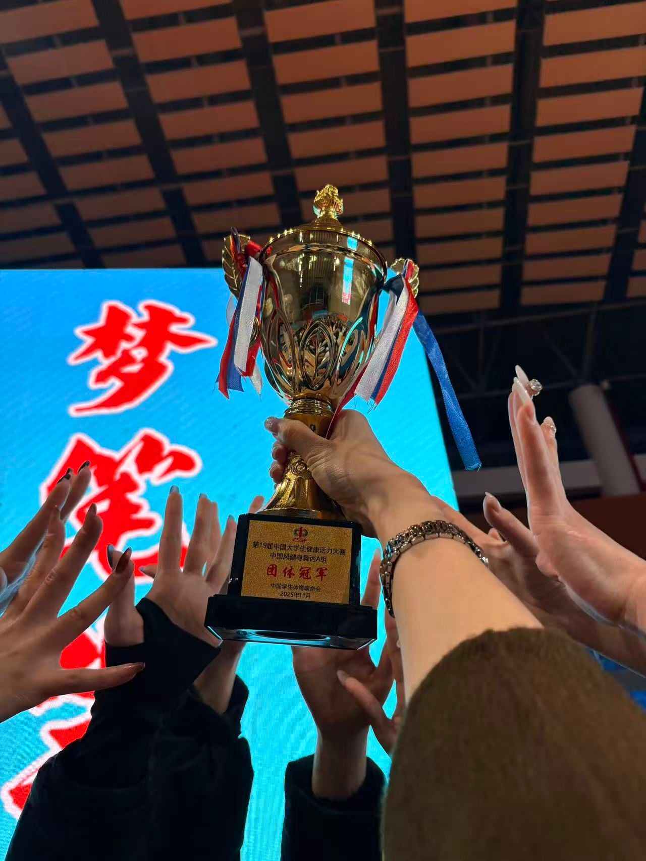 体育学院高度重视此次比赛,积极组织学生备战。最终,由李夏、余海燕两位老师带队,9名同学代表学校参赛。在比赛中,我院2023级表演专业学生汪家琪、刘丹阳、蒋晴晴、何鑫迪、尹悦、姜文艺、程媛、解雅欣,以及2025级研究生代子情团结协作、稳定发挥,于高水平组中屡获殊荣:荣获派对系列组第一名、自选动作轻器械集体组第一名、民族舞蹈系列组第二名,并一举夺得团体总冠军与最佳编排奖。