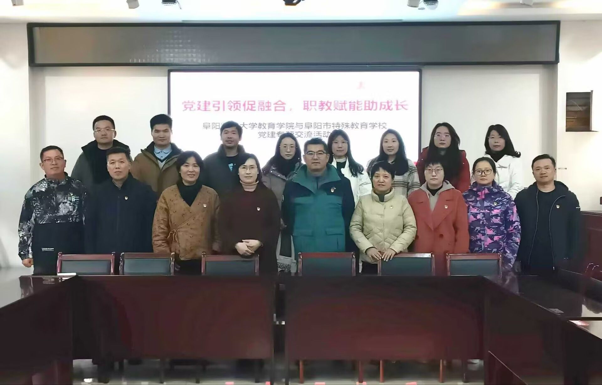 为深入学习贯彻党的二十大精神,推动党建与业务深度融合,充分发挥高校教育资源服务地方基础教育发展的积极作用,2025年11月19日下午,我院心理系与教育技术系教师党支部联合阜阳市特殊教育学校党支部,共同开展“党建引领促融合,职教赋能助成长”专题交流活动。双方党员教师、学生党员代表及特教一线工作者共40余人参加此次活动。