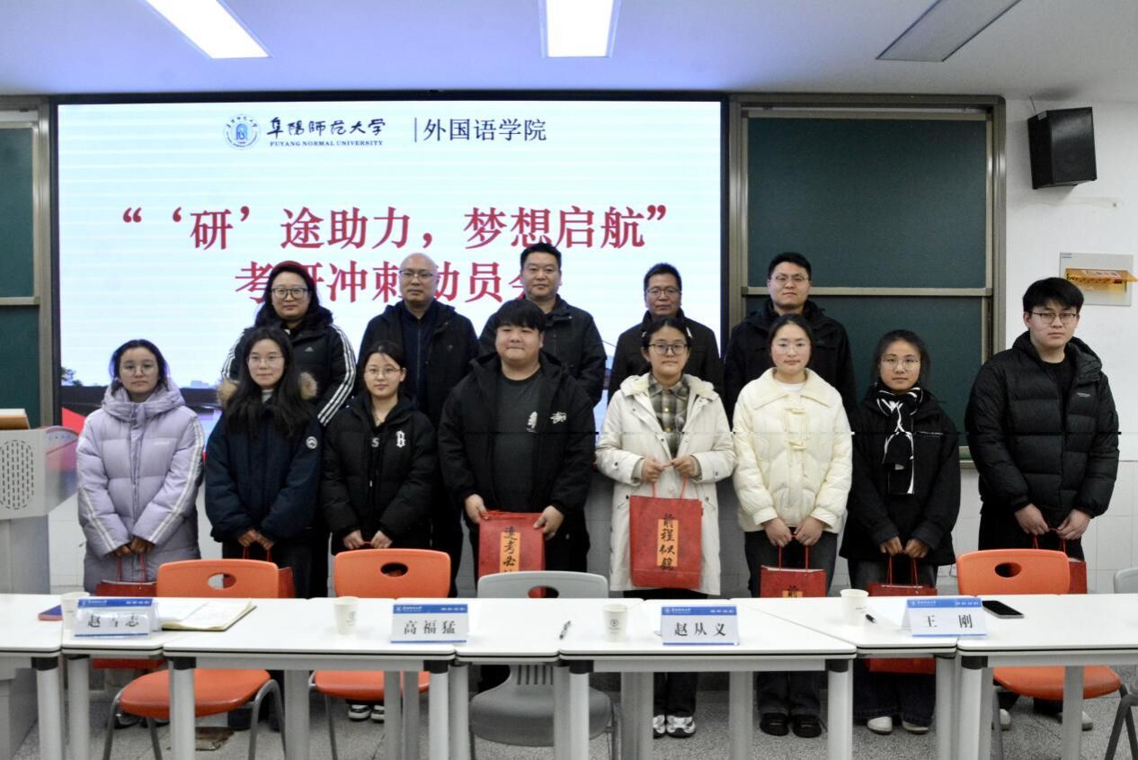 为鼓舞考研学子士气,坚定备考信心,12月10日下午,外国语学院在景行楼401举行2026年考研冲刺动员大会。外国语学院院长赵从义、党委副书记王刚、副院长高福猛、毕业班辅导员张远飞参加活动,活动由外国语学院团委负责人赵雪志主持。