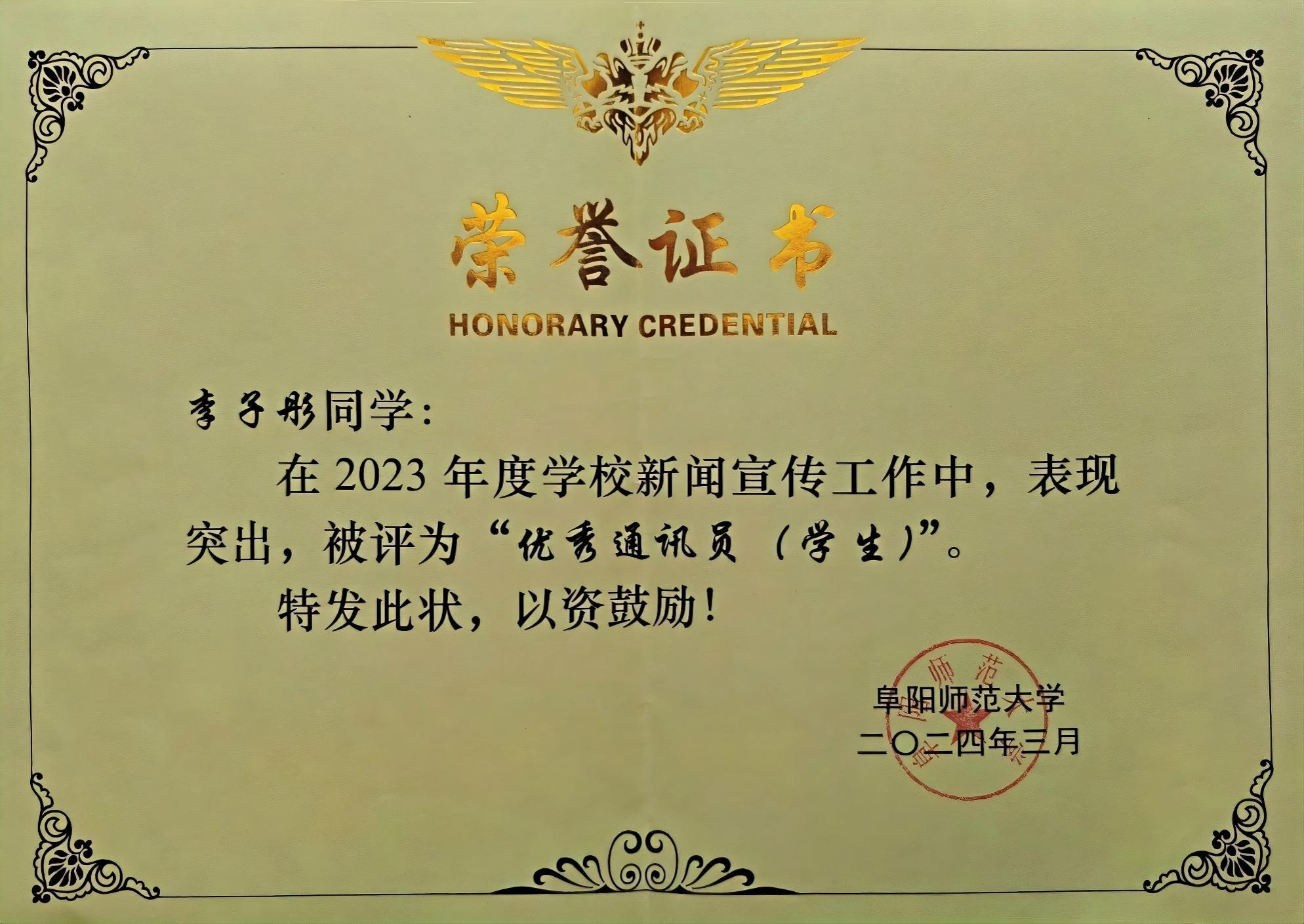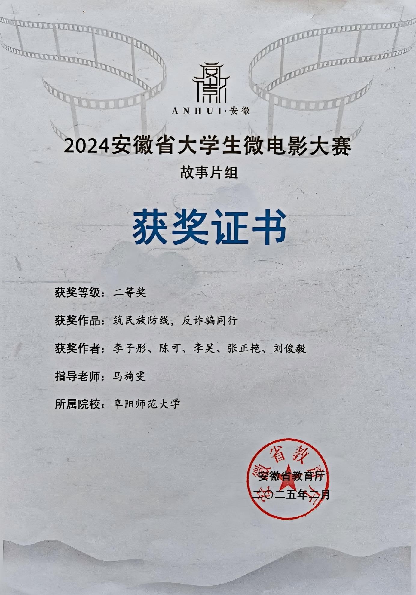 她曾担任校党委宣传部大学生记者团部门负责人、校学生资助政策宣传大使、文学院易班工作站副站长等多项职务,在学生工作与志愿服务中践行党员使命,以责任彰显担当。 在学业之路上,她始终以勤奋为路径、以钻研为利刃,连续三年智育与综测成绩稳居班级第一,用扎实的学识筑牢成长的根基。她先后荣获国家励志奖学金、优秀学生一等专业奖学金、自胜奖学金等荣誉,还获得了“三好学生”“优秀学生干部”“年度优秀学生资助宣传大使”等称号。 在实践赛场与创新征程中,她以专业为笔、以创意为墨,交出了一份亮眼的答卷。她凭借过硬的专业能力脱颖而出:荣获安徽省大学生微电影大赛二等奖、阜阳市第一届反诈短视频大赛一等奖等,用多元的成果诠释了新闻学子的实践活力。
