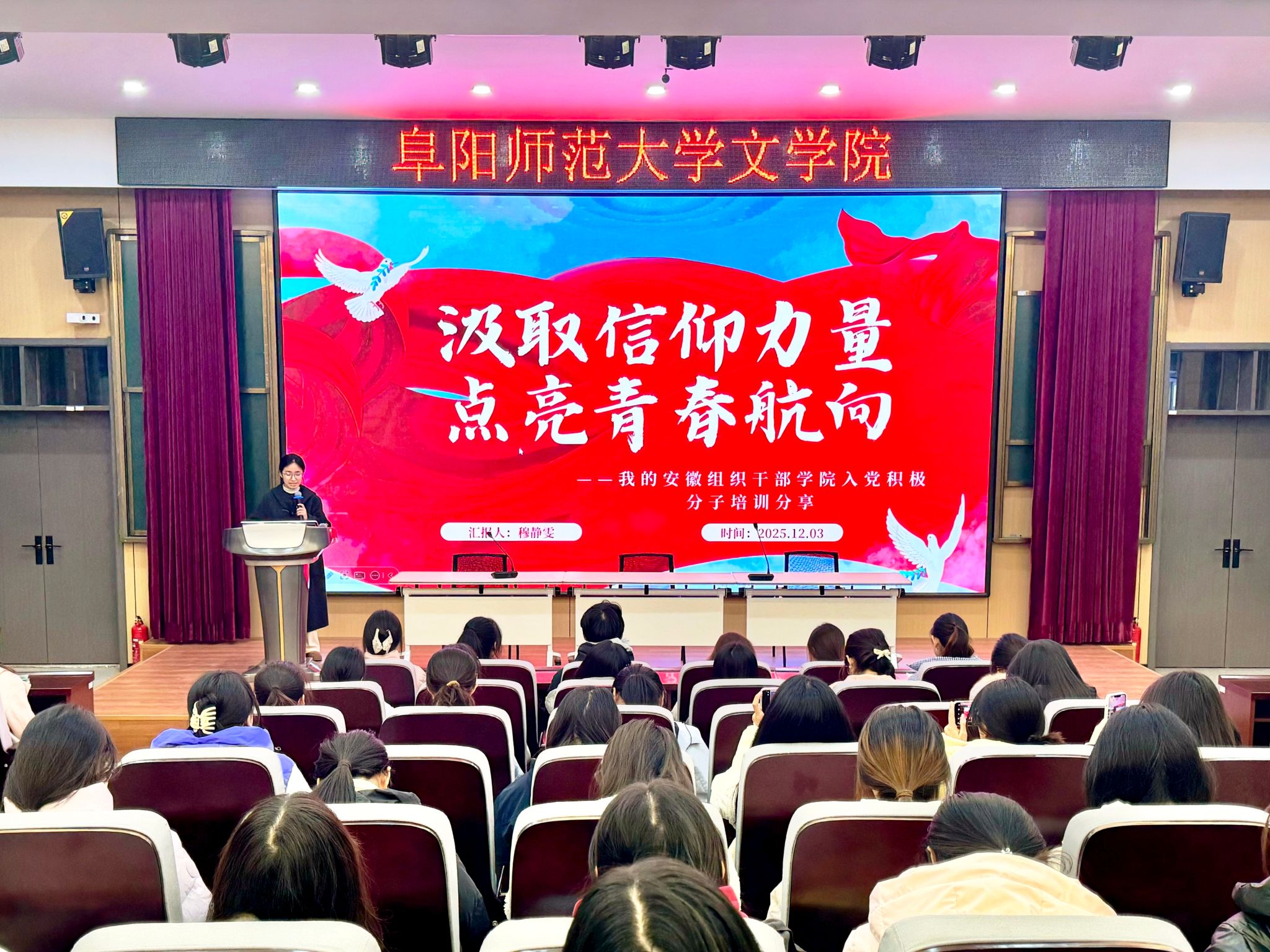 仪式后,文学院入党积极分子代表穆静雯作《汲取信仰力量 点亮青春航向》主题报告,分享了她在安徽组织干部学院入党积极分子培训班的学习心得。