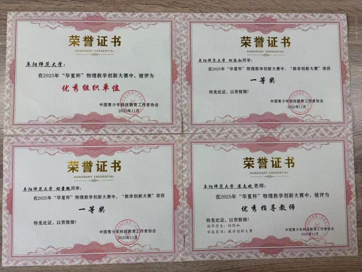 在2025年“华夏杯”物理教学创新大赛中,我院学子获得3个一等奖、3个二等奖、7个三等奖的好成绩。来自华东师范大学、东北师范大学、西南大学、华中师范大学、华南师范大学等117所高校的840名研究生和本科生参加了比赛。此项比赛由中国青少年科技教育工作者协会物理教育与普及专业委员会主办、陕西理工大学承办。