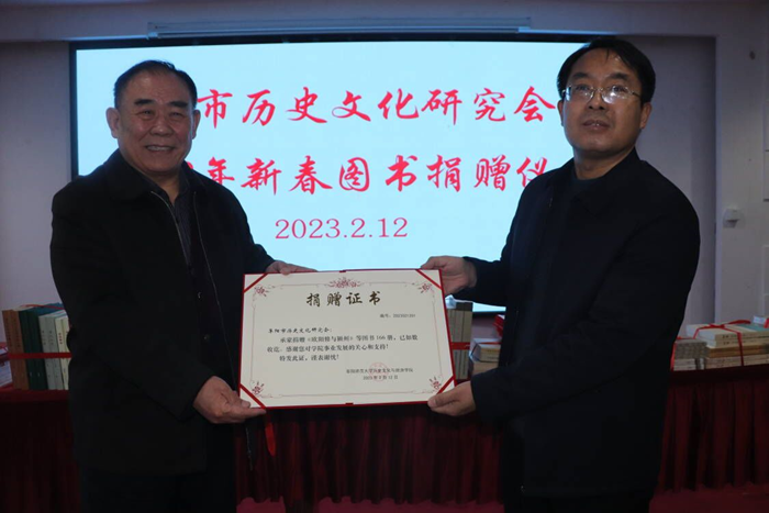 2月12日上午,阜阳市历史文化研究会向历史文化与旅游学院图书捐赠仪式在阜阳市怡莱酒店会议厅举行。学院院长陈雷教授、副院长郭从杰教授,阜阳市历史文化研究会会长李兴武参加捐赠仪式。