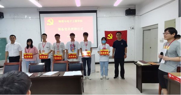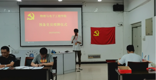 为进一步发挥学生党员的先锋模范作用,增强学生党员的政治意识和服务意识,2022年6月9日下午,物理与电子工程学院党委在躬行楼C505教室举行2022年第二批新党员授牌暨宣誓仪式。学院党委副书记张传智、组织员、各学生党支部书记、辅导员和本次发展的29位新党员参加此次仪式。仪式由电子信息系学生党支部书记陶清主持。