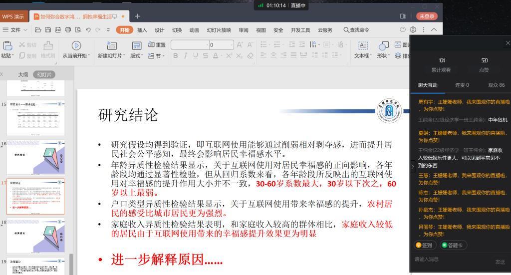 报告围绕课题的研究背景及意义、研究设计、研究结论和政策建议四个方面依次展开,另外,通过线上共享屏幕的方法给学生详细介绍了文献检索的基本方法以及数据分析常用的软件等,最后通过线上连麦邀请学生进行在线交流。王姗姗老师告诉学生,学术研究过程虽然比较烦琐,但是研究的过程能够培养思维逻辑能力和独立思考能力,并且鼓励学生要多做尝试。