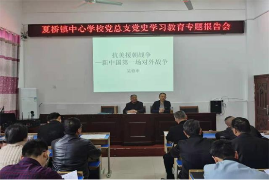 历史系教师支部党员吴修申教授分别走进颍上县夏桥镇中心学校、临泉县城东街道办事处张寨社区作主题宣讲。吴修申以《抗美援朝战争——新中国第一场对外战争》为题,从中国出兵朝鲜的原因、抗美援朝战争的战况、抗美援朝战争的意义、伟大的抗美援朝精神等四个方面进行讲解。
