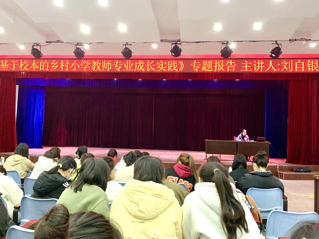 为提高小学教育专业学生的乡村教师职业认同感,推动专业认证整改工作开展,学院邀请六安市叶集区姚李镇中心校正高级教师刘自银副校长于 2月28日上午10点在西湖校区景行楼报告厅做了“基于校本的乡村小学教师专业成长实践”专题报告。报告会由小学教育系主任高艳军主持会议,全体2022级小学教育专业学生参加。