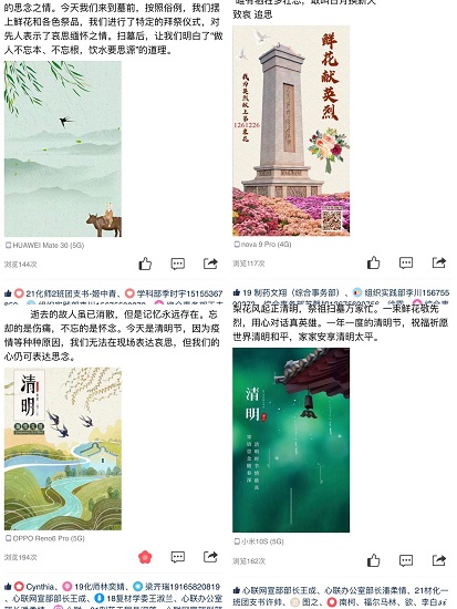 4月5日,清明节,同学们在QQ空间、朋友圈中以文字、图片等形式抒发感怀、寄托哀思,缅怀先烈、继承遗志、祈愿太平、守卫和平。