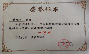 盛开的鲜花,凝聚挚爱的心血,平凡的事业,展示不平凡的人格。一直以来兢兢业业的张旭可,将全部精力投入到思政课教学中,致力于西藏地区的教育事业,她的坚持与意志终换来了荣誉与勋章。张旭可同学现在是山南完全中学初高中部政治学科教研组组长,在2021年5月举办的全国中小学青年教师教学竞赛山南市选拔赛中,张旭可凭借过硬的教学本领荣获得一等奖。高二下学期过半接班担任班主任,用半个学期时间让重点班学生成绩从全校倒数第三提升到全学校前列并一起保持。此外,张旭可还加入山南市思政名师工作室,开展课题研究,积极发挥引领、辐射作用,做好思政课实践教学示范工作。