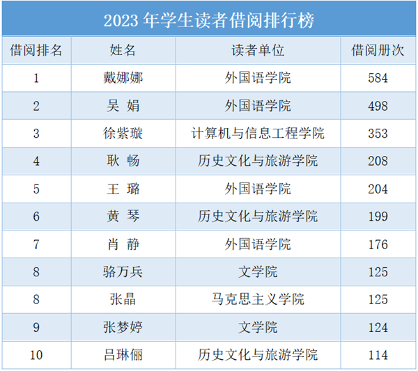 2023年阜阳师范大学图书馆年度服务报告公布,外国语学院共四名学生位列全校学生读者借阅排行榜前十名,其中戴娜娜、吴娟分别排名全校第一和第二,外国语学院还荣获全校图书借阅量前十学院,排名全校第四,外国语学院凭借优异的成绩在众多学院中脱颖而出。近年来,外国语学院不断发掘自身特点,创新载体平台、打造特色品牌,充分营造浓厚的书香氛围,持续深入推进“书香外院”建设,以浓郁书香文化推动优良学风建设,促进学院内涵发展。