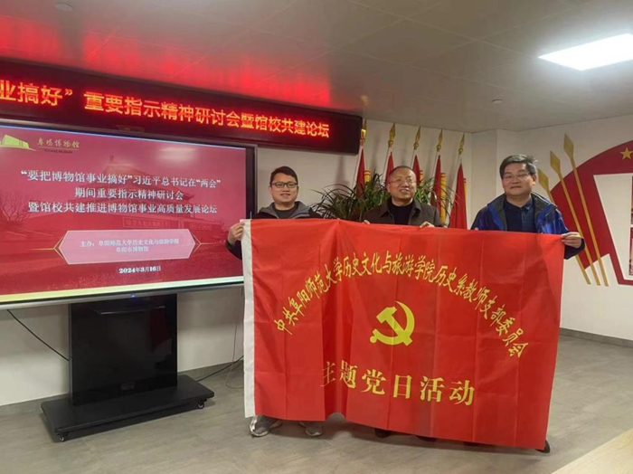 会后,历史系教师党支部与阜阳市博物馆党支部就党支部结对共建进行了交流,双方共同认为,在“博物馆热”的新形势下,将业务发展与党建紧密结合,推动博物馆事业高质量发展,让文物说话,讲好中华民族故事,进一步发挥博物馆在坚定文化自信上的重要作用。