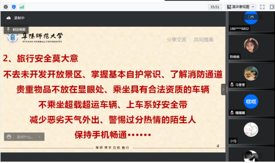 赵晨阳强调了假期间需要注意的出行安全、居家安全、心理安全和防范电信诈骗等问题。假期间不去未开发开放景区,掌握基本自护常识,乘坐具有合法资质的车辆,上车系好安全带。同时要提高网络安全防范意识,不要相信网上借款、网上贷款等行为。在假期要注重培养兴趣、增长技能、走向户外、享受生活。