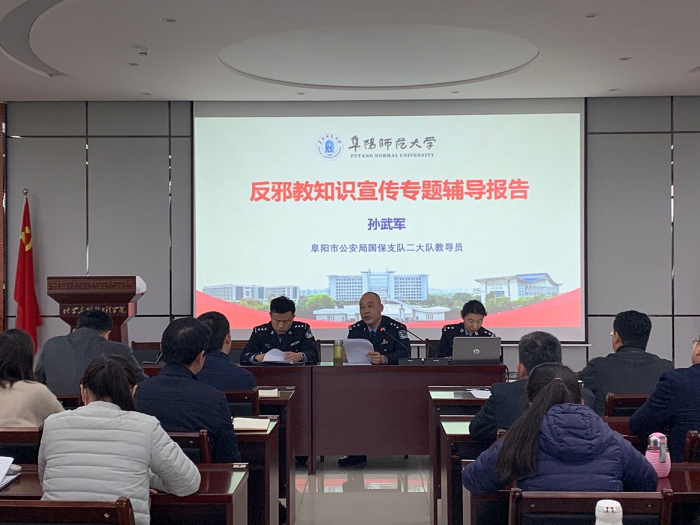 会议邀请阜阳市公安局国保支队二大队教导员孙武军、颍州区公安分局刑警大队副大队长李娟娟分别就“校园反邪教”和“校园反电信网络诈骗”作专题辅导报告,颍州区公安局颍西派出所副所长王枫就近年来辖区高校涉案警情作了通报。