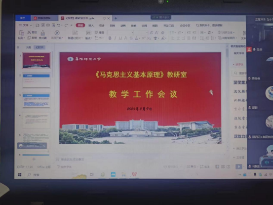 为更好开展新学期原理课教学工作,提高课程任课教师教学水平,2月9日晚上,马克思主义学院“马克思主义基本原理概论”课程教研室线上召开新学期教学工作会议。马院教学督导组组长张红、思想政治理论课教学部主任赵永明、习近平新时代中国特色社会主义思想概论教研室主任郝海洪和承担《马克思主义基本原理概论》课教学任务的全体教师参加了此次会议,会议由“马克思主义基本原理概论”教研室主任杨军主持。