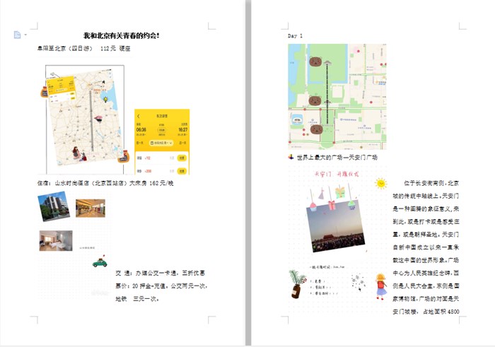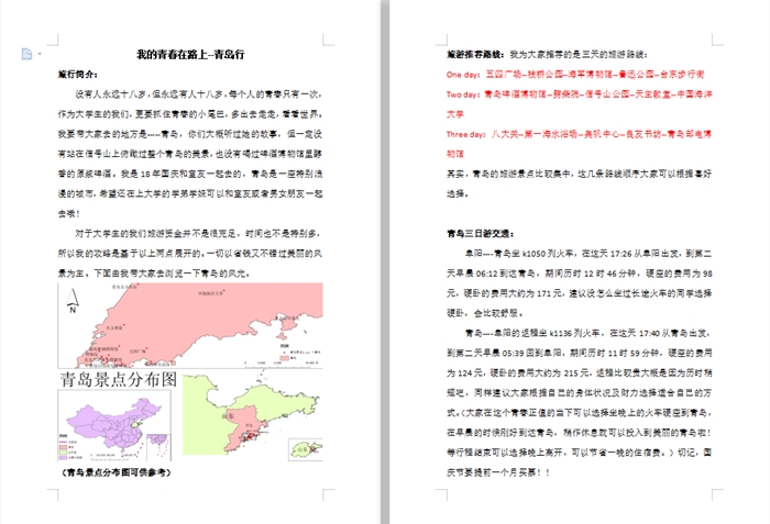 同学们结合自身旅游经历及对祖国大好河山的热爱与了解,从旅游路线、交通方式、饮食住宿、名胜介绍、娱乐购物、资金预算和应急预案等方面设计旅游攻略。选手线路设计涉及北京、西安、内蒙古、西藏、大理、青岛等特色旅游城市,有的生动详细,有的趣味横生,天堂之旅——西藏,七彩之旅——云南,美食之旅——西安......每个参赛作品都各具特色,不管是沿途的美景、当地的特色美食,还是自己的所感所想,都让人流连忘返。旅游是一段旅程,记忆却永远都在。经过评委老师的商讨与打分,对其中优秀作品进行表彰,并在学院微信公众号进行推送。