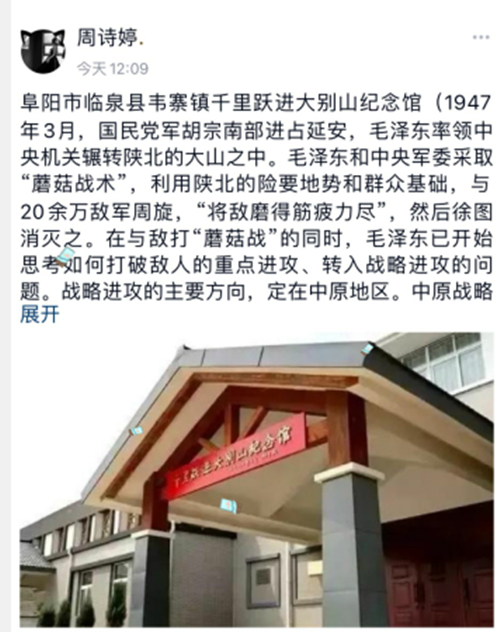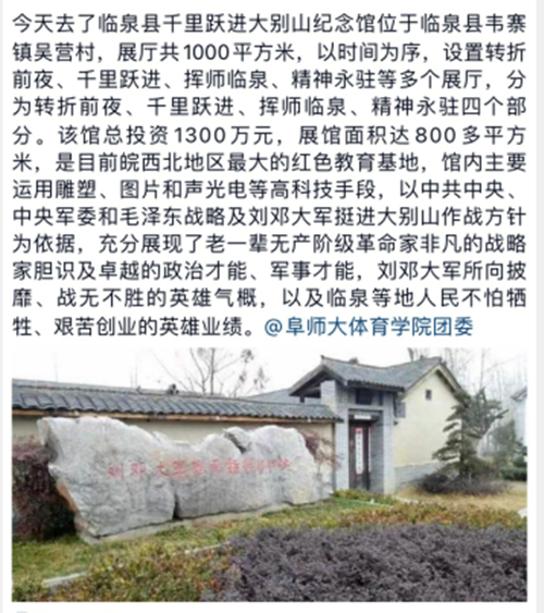 家在临泉的几位同学约着一起前往临泉县的千里跃进大别山纪念馆,他们在线上分享千里跃进大别山纪念馆里的故事。他们告诉身边的同学:“老一辈的光辉事迹让我知晓了我党艰难创业的伟大,知晓了我党先进性的内涵,知晓了信仰力量的伟大和坚不可摧。他们所向披靡、战无不胜的英雄气概,以及各地人民不怕牺牲、艰苦创业的英雄业绩,才有了今天。少年强则国强,只有在我们这一代好好努力好好奋斗,国家才能真正走向富强!”还有同学借着五一假期来到了江苏镇江的扬中烈士纪念馆,通过参观调研了解到扬中历来具有光荣的革命传统,在革命战争和社会主义建设时期,扬中人民在党的领导下,为了国家的利益,民族的尊严和祖国的建设,前赴后继,英勇奋斗,创造了许多可歌可泣的英雄业绩。多少英雄儿女抛头颅洒热血,为祖国献出了自己年轻的生命。烈士们永垂不朽,英名长留,浩气永存,与日月同辉,与天地共存。线上大家积极分享,热烈讨论,2018级体育教育专业韩旭同学表示:“我们应自觉传承好红色基因,坚定理想信念,发扬革命精神和斗争精神,更好地担负起实现中华民族伟大复兴的历史重任。”
