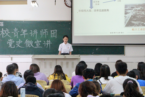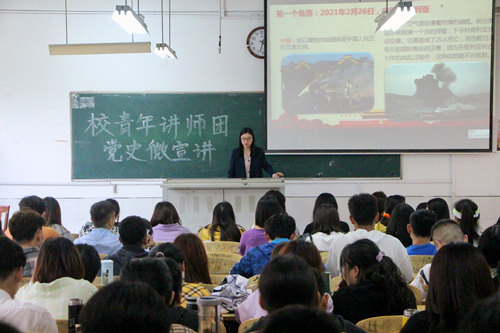 戴倩雯老师宣讲的主题是:“青年人为什么要学习党史?”她指出读懂历史,才能读懂“为中国人民谋幸福”的初心;熟知历史,才能树立旗帜鲜明地反对历史虚无主义;以史为鉴,乘风破浪迈向新征程。青年讲师赵群在最后说道:“青年引领时代,时代成就青年。党的十九届五中全会,为我们擘画了未来五年、十五年的发展蓝图。未来是一片新的蓝海,承载着十四亿人口的巨轮即将驶入下一片深水区。历史的接力棒,已经交到了我们这一代人手中。”