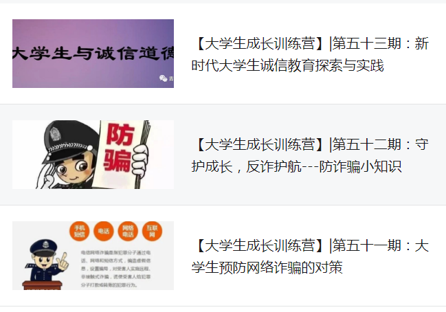 依托微信公众号“青年微思享”线上发布“大学生预防网络诈骗的对策”、“守护成长,反诈护航---防诈骗小知识”、“新时代大学生诚信教育探索与实践”的主题学习活动”等内容,各班级开展线上学习,将教育纳入、渗透到日常教育中,不断增强学生防范意识,筑牢“平安校园”基础。