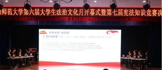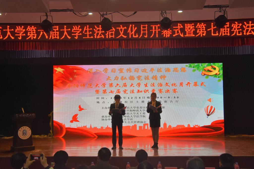 为深入学习习近平法治思想,贯彻落实中央关于深入学习宣传和贯彻实施宪法的部署,弘扬宪法精神,维护宪法权威,同时为了进一步提高大学生宪法意识,提高法律素质,培养知法、懂法、守法、用法的学生,由校党委宣传部、校团委、校关工委主办,法学院承办的阜阳师范大学第六届大学生法治文化月开幕式暨第七届宪法知识竞赛决赛,于2020年12月4日晚在西湖校区景行楼小礼堂隆重举行。