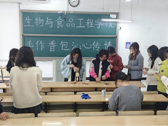 为传承中华优秀传统民俗文化,丰富大学生校园文化生活,帮助同学们在动手实践中释放心理压力、调节情绪,生物与食品工程学院心理委员联合会于2026年3月28日下午2:30在躬行楼D105举办了以“手作香包,沁心传情”为主题的中草药香包制作活动,旨在让同学们沉浸式感受传统手工艺的魅力,在集体创作中增进交流互动,进一步提升心理归属感与幸福感,丰富校园心理文化生活。