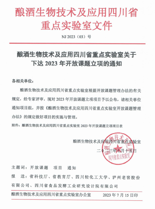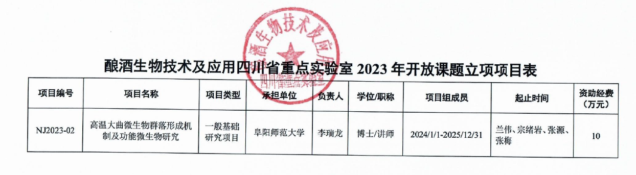 近日,四川轻化工大学酿酒生物技术及应用四川省重点实验室公布了2023年开放课题立项项目,生物与食品工程学院、安徽省功能性果饮生态发酵工程研究中心李瑞龙博士申报的“高温大曲微生物群落形成机制及功能微生物研究”项目获批立项。