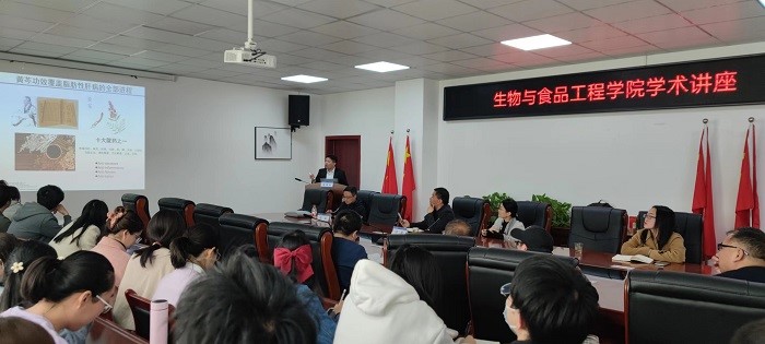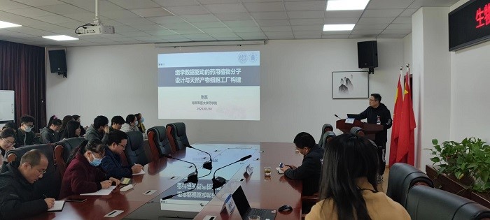 2023年3月30日上午生物与食品工程学院邀请了海军军医大学药学系教授张磊和兰州大学戴建业教授在躬行楼E215会议室为生工院的师生分别作了“组学数据驱动的药用植物分子设计与天然产物细胞工厂构建”和“多种组学策略驱动天然产物药效机制的原始创新研究”的学术报告。报告由生工院副院长唐俊主持,学院研究生、部分本科生和相关研究领域的教师聆听了报告。