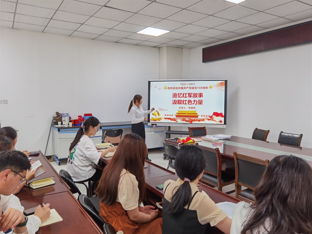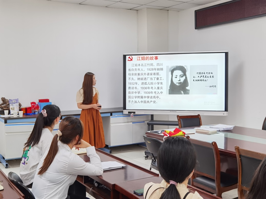 活动伊始,韦兵领读宣誓誓词,全体党员面对党旗再一次庄重地作出自己对党的庄严承诺,重温入党誓词。随后两名宣讲团成员苏晓慧、李悦依次向大家分享党史故事,汲取红色力量。首先苏晓慧同志以自己家乡所发生的红色革命为故事素材,向大家分享“一座红军墓就是一座丰碑”的红军故事,并在最后号召所有党员同志要珍惜这个弥足珍贵的时代,做一名眼里有光的青年党员。之后李悦同志分享了江姐的故事,带领所有党员同志体会江姐不辱使命、勇立潮头的担当精神,坚守信仰、忠于理想的革命精神,心怀天下、舍生取义的牺牲精神。活动最后,韦兵总结了两位党员同志分享的主要精神,并呼吁大家在今后日常学习生活中要学党史、悟党史,践行行动、担使命的理念。