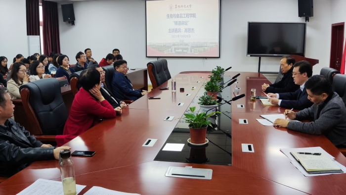 为进一步深入推进师德专题教育,强化全体教职工立德树人职责引领,引导广大教师以德立身、以德立学、以德施教、以德育德,10月21日,生物与食品工程学院举办“牢记初心使命,争做‘四有’好老师”师德专题教育报告会。报告会邀请“时代楷模”、“党的十九大代表”、“全国优秀共产党员”我校马克思主义学院党总支书记高思杰作报告。学院党委书记孙华主持报告会。