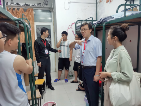 走访中,学院领导与新生们亲切交流,在热烈欢迎新同学到来的同时,嘱咐同学们珍惜在校时光,走出宿舍、走向操场、走进图书馆和教室,培养积极健康的生活习惯;告诫同学们要严格遵守校规校纪,在当前疫情下坚持把做好防护作为日常学习、生活的首要条件;勉励同学们秉承学校精神和学院意志,树立深造目标,励志勤学、锐意进取、奋发有为。随行班主任与辅导员助理也纷纷深入各自班级寝室,查看设施状况,仔细了解了同学们入住情况,详细解答了同学们关于学习生活的有关问题,就宿舍用电安全、防网络诈骗与推销等做了强调。