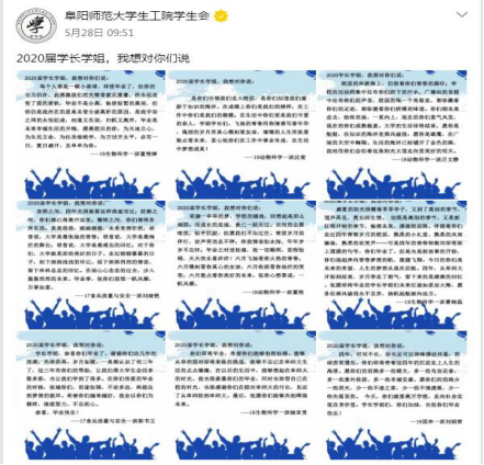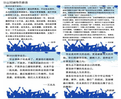 该院先后开展了“同窗的你”、“温馨毕业季之寻找身边的榜样”、“走进你心”等多项特色主题活动,希望毕业生心怀对母校的感恩和希冀踏上未来新征程。该院发挥新媒体宣传平台优势,开展线上毕业互动、策划“毕业影像集锦”、“毕业班辅导员寄语”、“学弟学妹送给毕业生的祝福”等专题版块,广泛征集与2020届毕业生有关的素材,在官方QQ平台上精心推出,营造了浓厚的毕业氛围,取得良好的反响,不少同学表示毕业季的纪念活动非常“走心”,从视频中、从纪念照片中,看到同学们四年来的成长和进步,同时深切的感受到同学们对母校、学院深深的依恋和感恩。该院学生会成员给2020届毕业生制作了毕业季短视频,一晃四年,匆匆又夏天。从大一的初次相遇,到大四的即将别离,时光飞逝,转眼间便匆匆穿上了奔赴社会的职业装。今将离别,愿彼时灿烂,念后会有期。