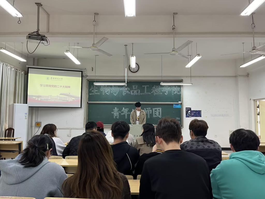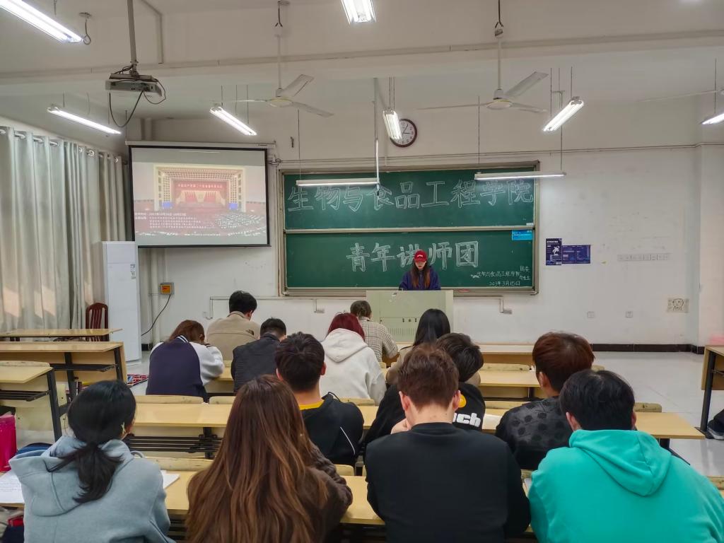 燃青春炬火,发时代强音。为学习宣传贯彻党的二十大精神,充分发挥“青年讲师团”理论武装“轻骑兵”作用。3月15日下午,生物与食品工程学院青年讲师团成员沈泽胜、姚雨蝶在躬行楼D楼211开展宣讲,大三各班班干部和学生会成员参会。