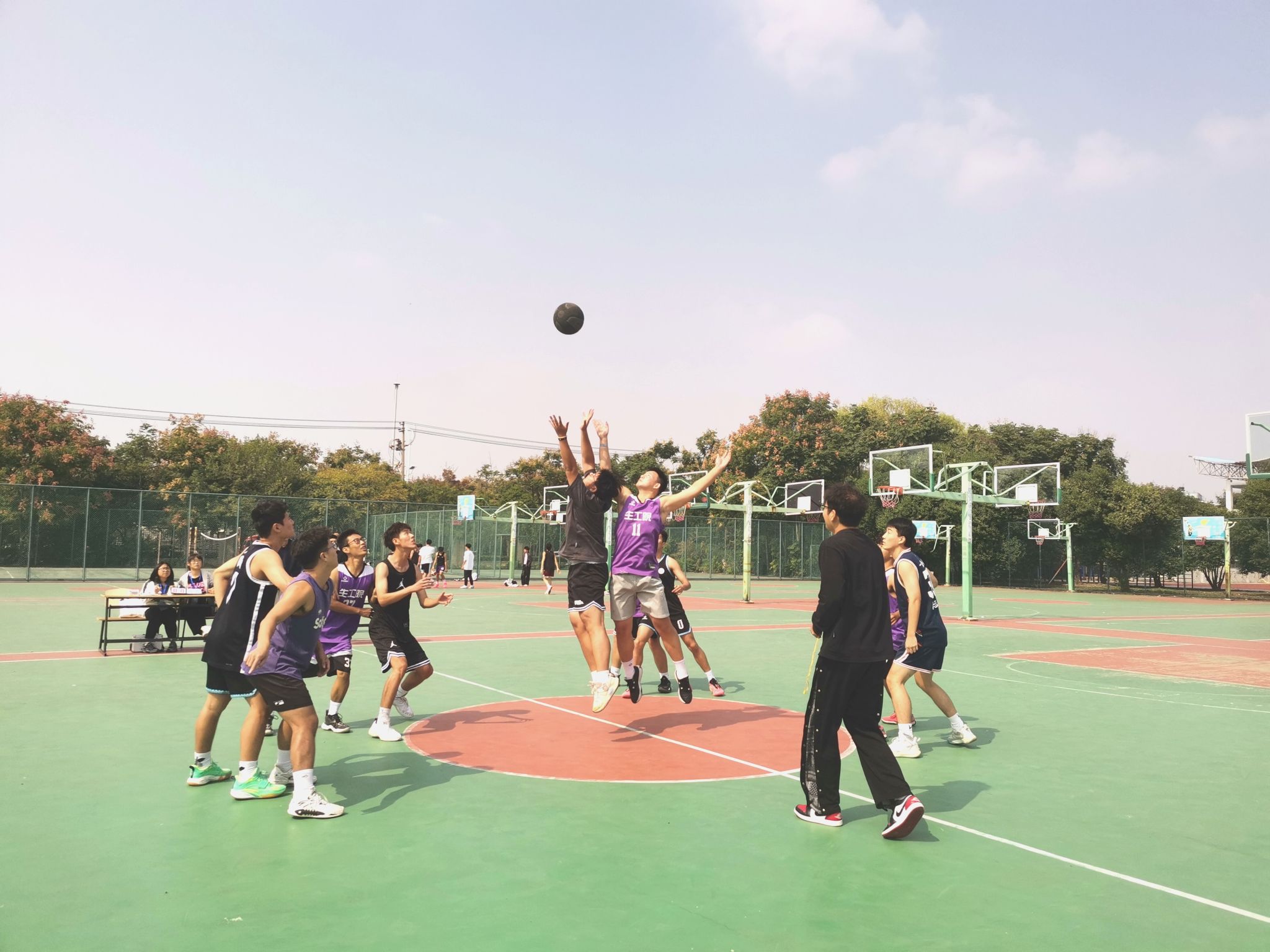 在阳光明媚的午后,操场上人声鼎沸,新生们满怀激情地投入到这场盛大的篮球赛中。比赛中,大家挥汗如雨,既有针锋相对时的紧张激烈,也有赛后轻轻碰拳的洒脱与尊重。球员们在场上奋力拼搏,场下的观众也热情高涨,加油声、欢呼声此起彼伏,整个篮球场洋溢着青春的活力与激情。