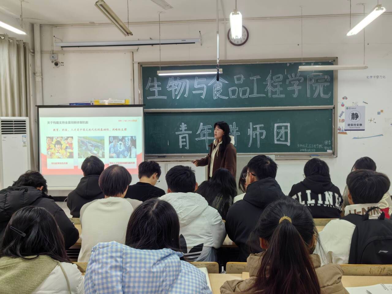 为促进学生深入学习党的理论知识,加强党性观念教育,进一步夯实广大青年坚定不移跟党走的信念和意志,阜阳师范大学校青年讲师团走进生物与食品工程学院,并于11月28日下午在躬行D楼107召开了以“党的二十届三中全会精神”为主题的宣讲活动。本次宣讲的主讲人为李育鹏老师,各级同学积极参与此次青年讲师团宣讲会。