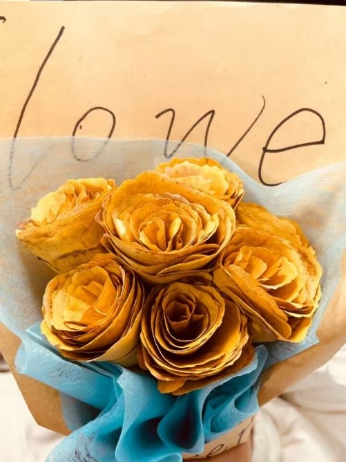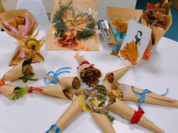 活动伊始,围绕党的二十大报告关于“推动绿色发展,促进人与自然和谐共处”及对广大青年的殷切寄语等精神做了宣讲;2021级刘旭旭同学做了专业知识讲解、并就制作要点做了现场演示。活动中,同学们以小组的形式三三两两聚在一起,精神饱满、热情高涨、释放自我,青春欢乐的气氛贯穿始终。在简单的工具、专业的加持、青春的创意结合下,衰黄的落叶在同学们手中重新被赋予了生命与魅力,如作品《花叶和鸣》,表达了“叶与花不分你我,共同守护着为人们带走阴霾的初心”。活动结束后,同学们将制作好的一束束“落叶花束”送给了老师、宿管阿姨等,表达着他们对教育工作者、校园建设者的感谢与慰问。