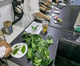 活动开始前参与人员要认真细致地了解了叶脉书签的制作原理和过程。制作人员先将新鲜叶片清洗干净,经过几道工序,一片片貌不惊人的叶片逐渐变得晶莹剔透起来,成为独一无二的专属书签。
