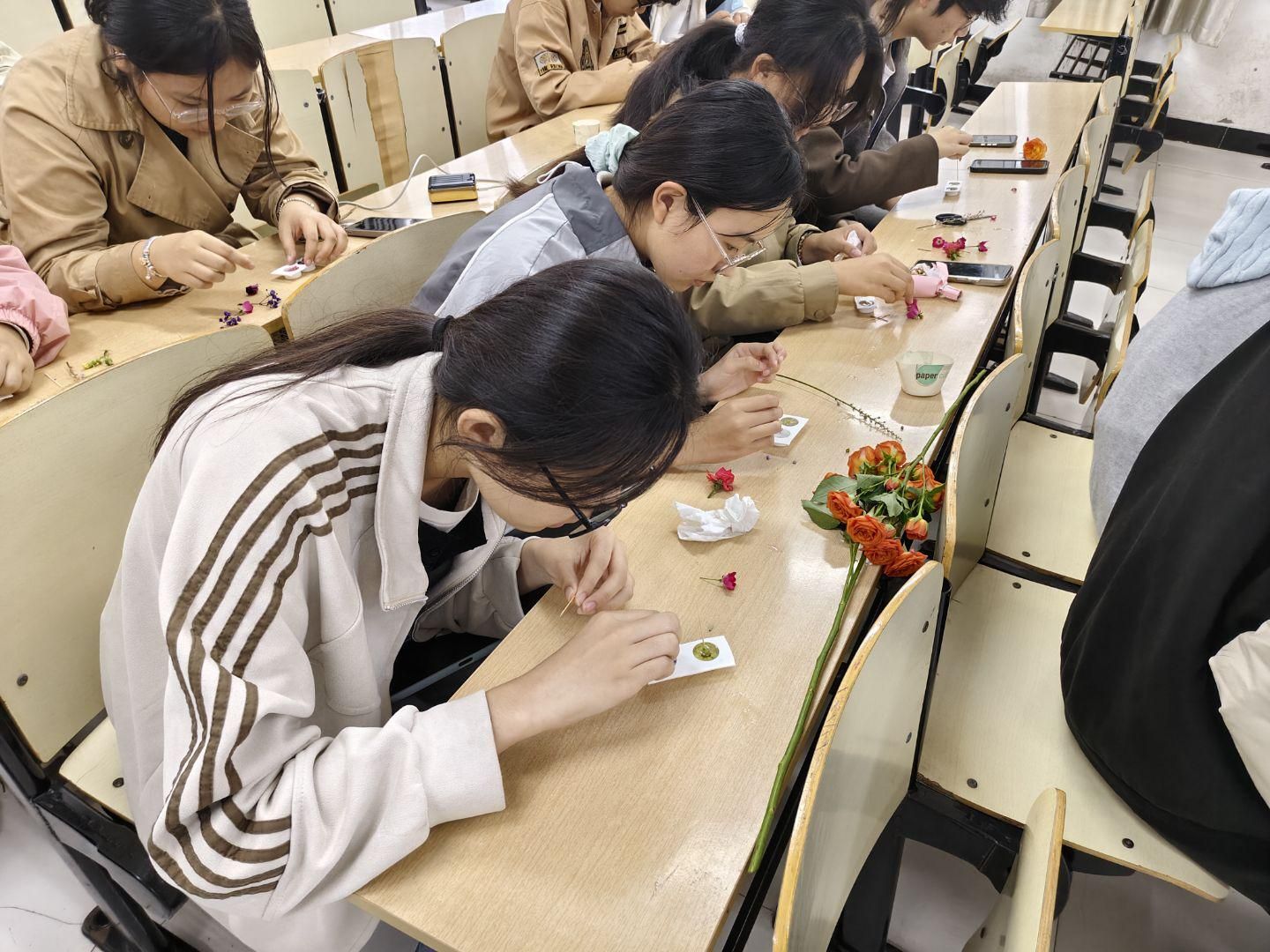 为提升大学生的心理健康水平,帮助大学生在艺术创作中找到内心的宁静与平衡,生物与食品工程学院心理委员联合会于2025年10月18日下午2:30在躬行D楼107教室组织开展了以“花驻纽扣,艺锁时光”为主题的干花纽扣活动,旨在借助自然干花的疗愈功效提高参与者的幸福感,缓解参与者的心理压力。