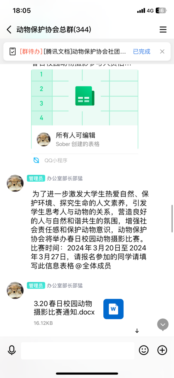 本次活动以“春和景明处,往返动物间”为主题,面向社团内同学,同学们通过拍摄主角为校园动物的照片参加比赛,结合自己的摄影风格,叙述自己的镜头故事。在比赛结束后会选出优秀作品并颁发奖状。该活动不仅能够丰富同学们的课余生活,使其走进平时我们可能忽略的动物生活,记录小动物们在校园中的美好瞬间,还能引发学生思考人与动物的关系,营造良好的人与自然和谐共生的氛围,增强社会责任感和保护动物意识,弘扬积极向上的正能量,建立健全人格。