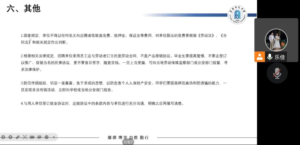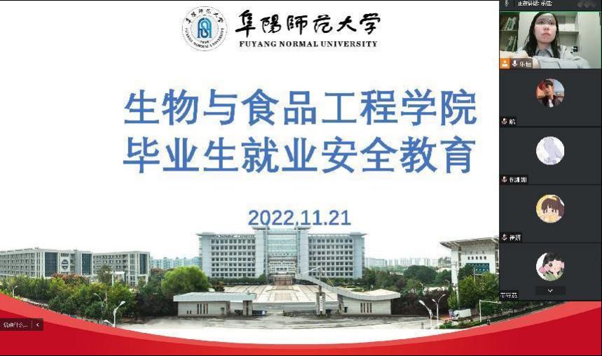 为增强毕业生就业安全意识,提高毕业生在求职就业过程中的自我防范、自我保护能力,11月21日下午,生物与食品工程学院举办了毕业生就业安全教育专题讲座。本次讲座通过腾讯会议在线进行,由2019级毕业班辅导员孙乐佳担任主讲人,2019级全体学生参加。