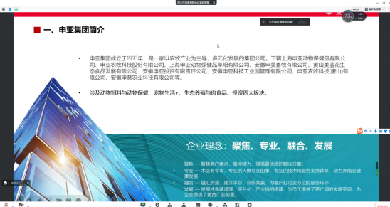 申亚生物科技股份有限公司招聘负责人结合PPT,向参会毕业生宣讲介绍了公司的发展史、经营理念、企业文化、业务范围、招聘需求等情况。随后,毕业生就自己关注的具体问题与招聘负责人进行了线上交流咨询。